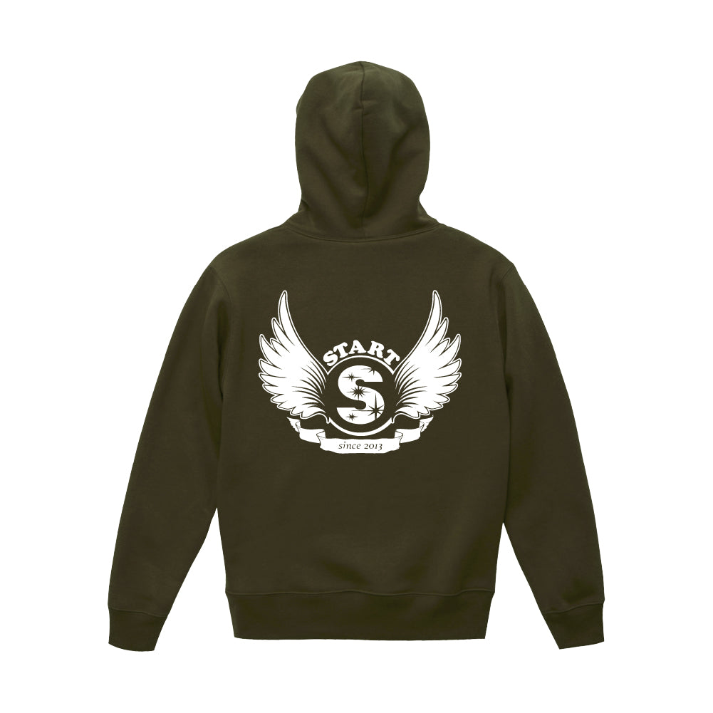 定番のSTART羽根ロゴデザインを背面にプリントした裏起毛フルジップパーカーです。